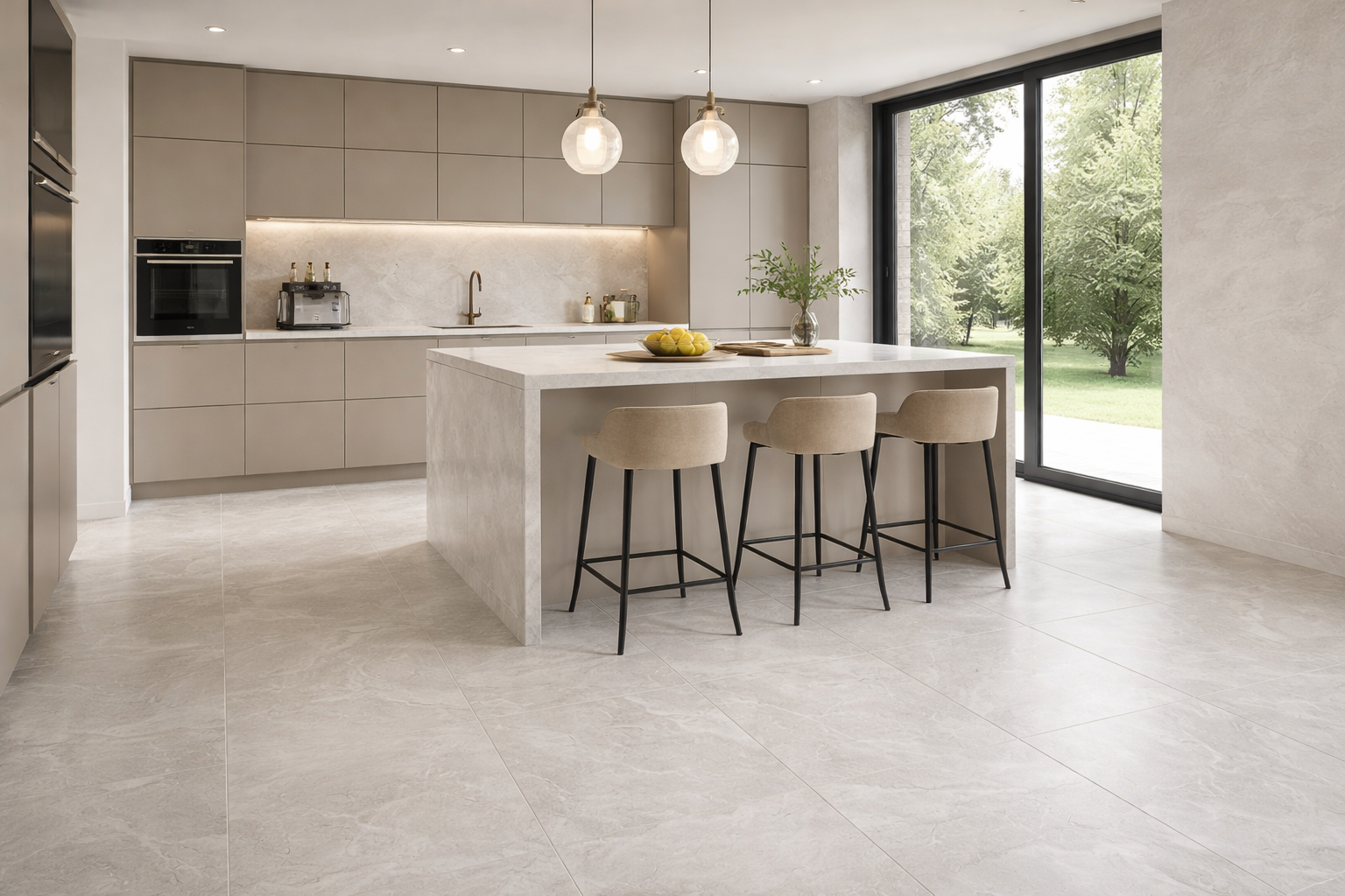 Pair with brushed brass for warmth, matt black for contrast, or chrome for a crisp modern finish. To soften the cool grey palette, introduce natural wood cabinetry or textured fabrics. In open-plan spaces, the larger formats reduce visual breaks, creating a calm, expansive surface that feels refined and architectural.