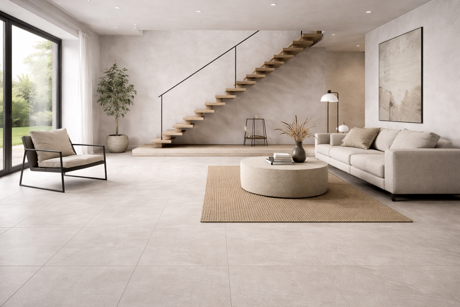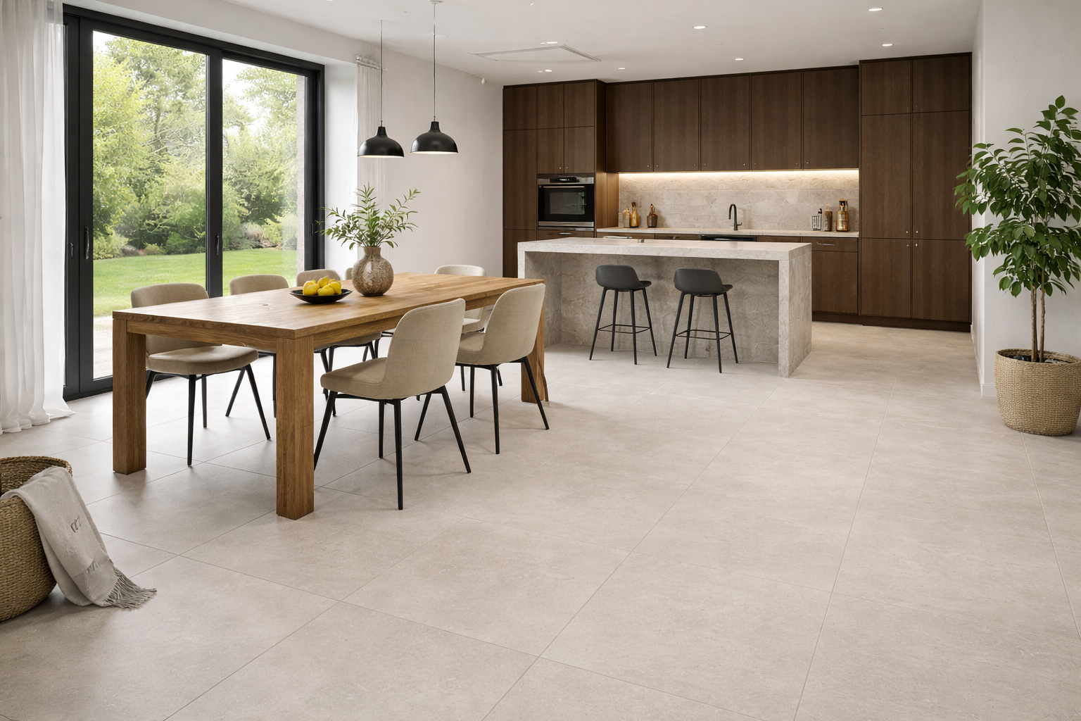 Alpina is a refined matt porcelain tile inspired by soft architectural concrete, available in 80×120cm. Designed for modern UK homes, it delivers a clean, understated finish ideal for bathrooms, kitchens, living areas and open-plan spaces.