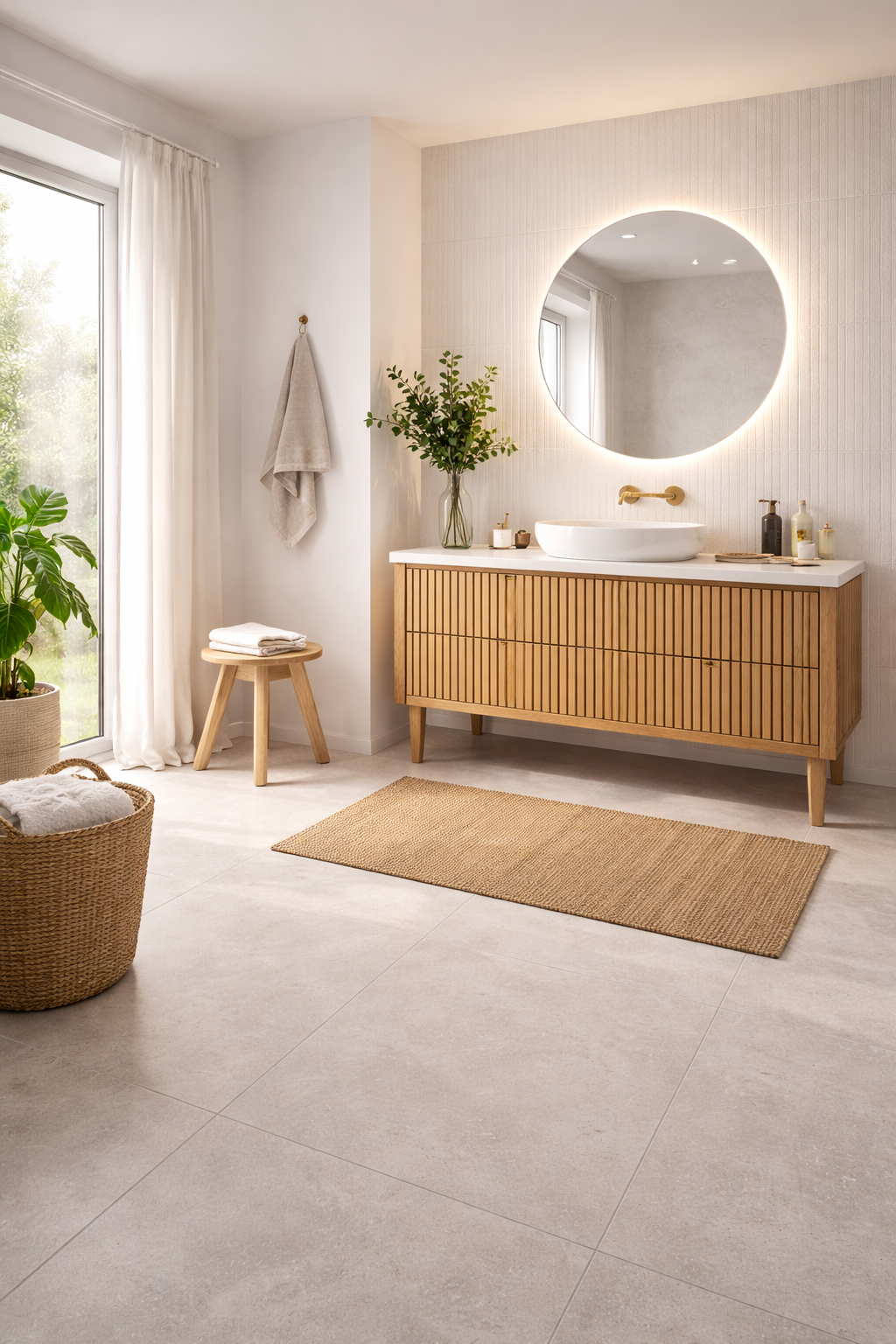 Alpina delivers the clean aesthetic of architectural concrete with the strength and practicality of porcelain, offering flexible sizing to suit both compact bathrooms and expansive modern interiors.