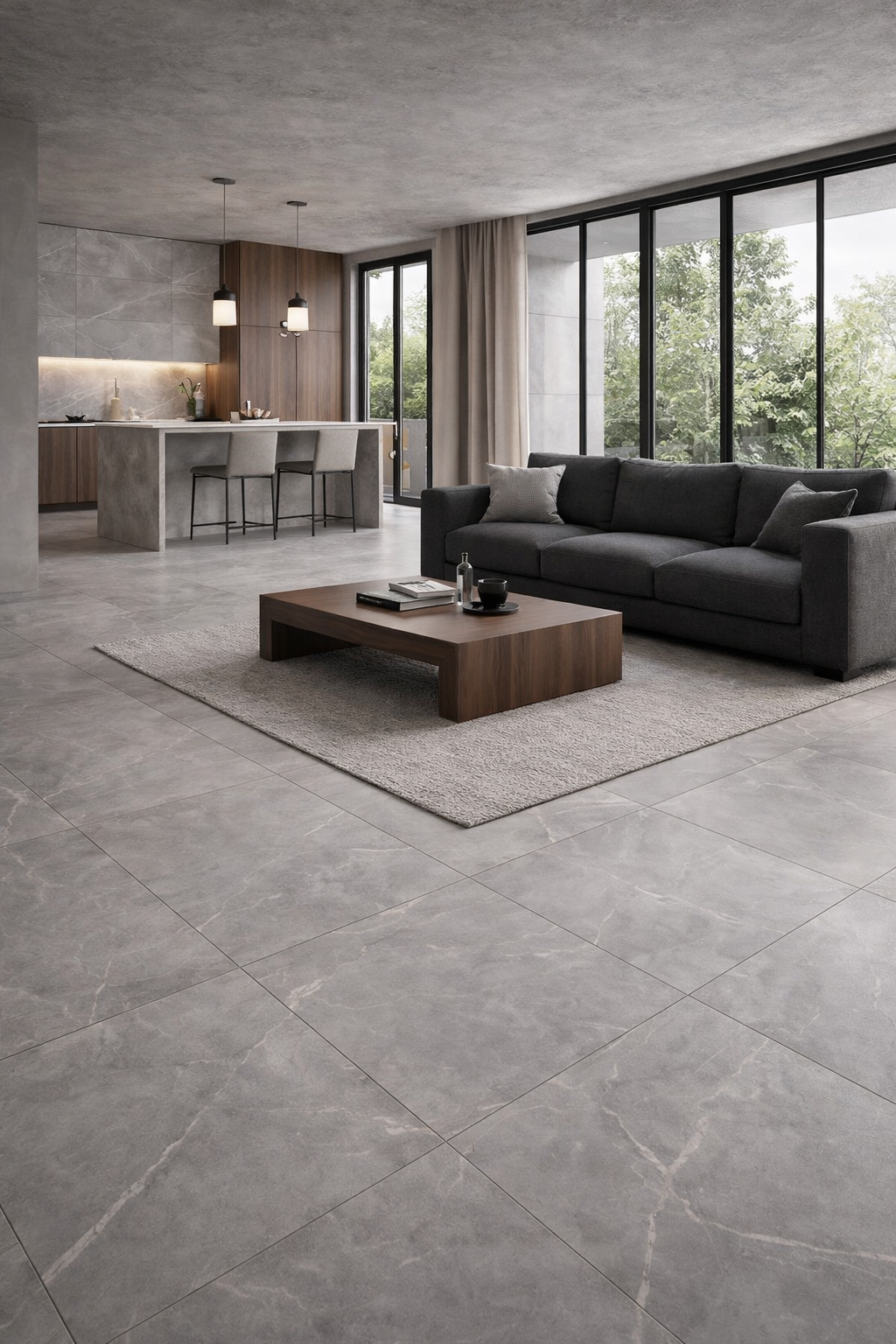 In open-plan living spaces, the 60×120 format enhances scale and visual continuity. Combine with walnut cabinetry, soft neutral furnishings and textured fabrics to balance the stone movement.