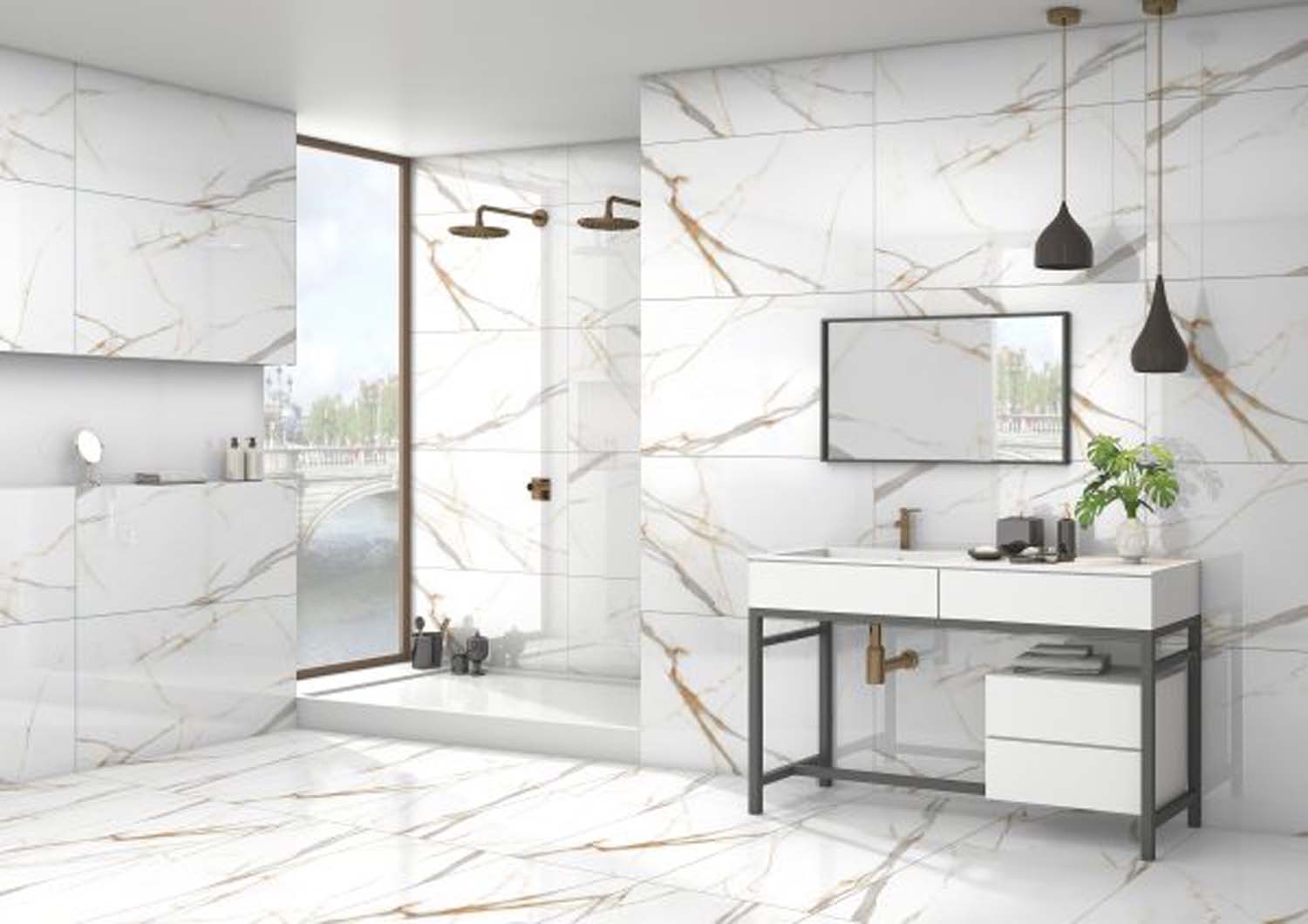 Make a bold statement with Aurum, a premium 60×120 cm porcelain tile designed to bring luxury and timeless elegance to any interior. Its high-gloss finish paired with a striking gold marble-effect veining evokes the richness of natural stone while offering the easy maintenance and strength of porcelain.