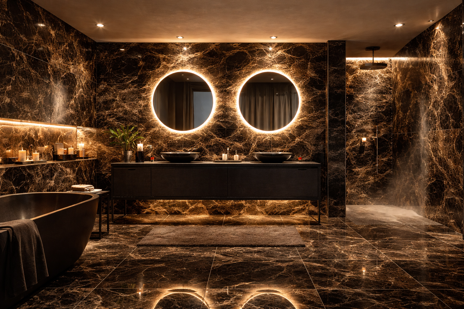 To soften the impact, balance with neutral furnishings such as warm taupe upholstery, natural wood cabinetry or textured fabrics. A light grout will maintain continuity, while a slightly warmer grout can subtly enhance the gold detailing.