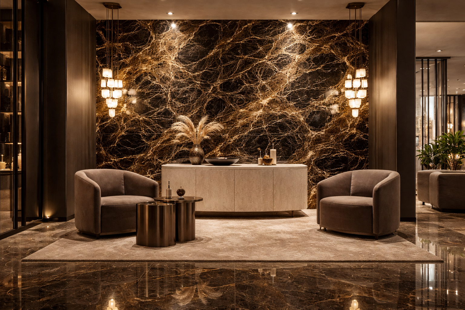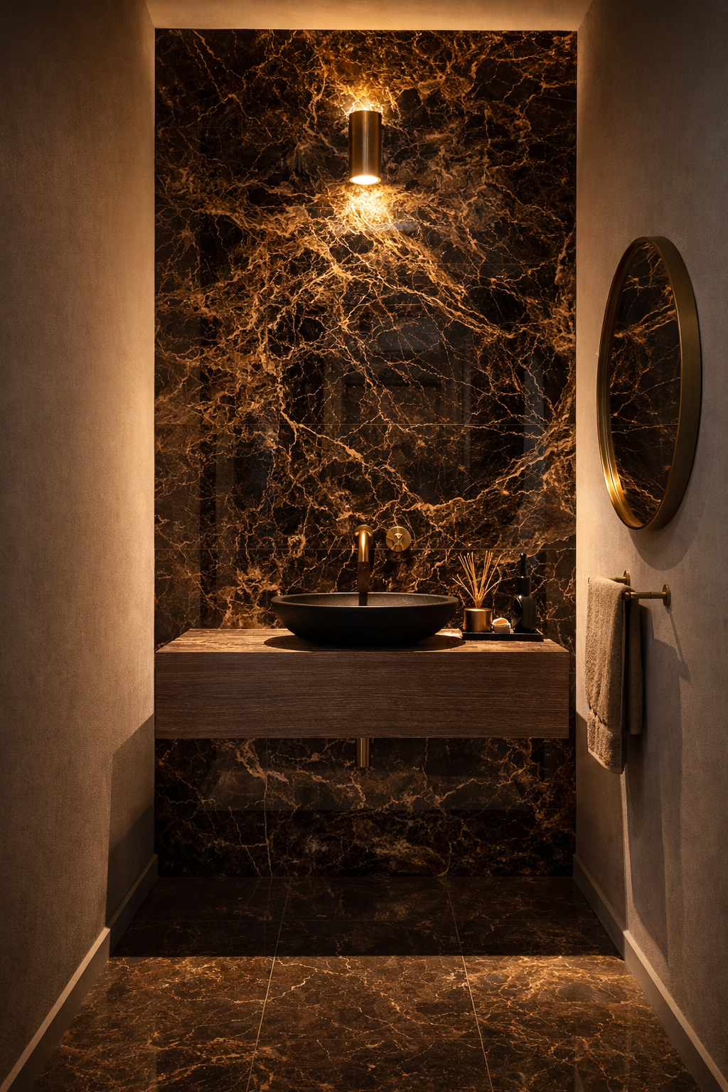 Aurum performs beautifully as a full-height feature wall behind a vanity unit or media wall, where the polished surface can reflect ambient lighting and highlight the richness of the gold veining.