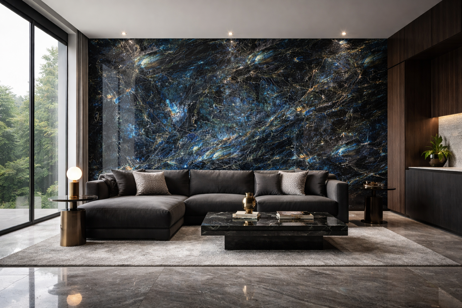 In living areas, balance the richness of the blue tones with neutral upholstery in soft taupe, warm grey or cream. Walnut or dark oak cabinetry enhances the depth of the tile, while metallic accents elevate the overall finish.