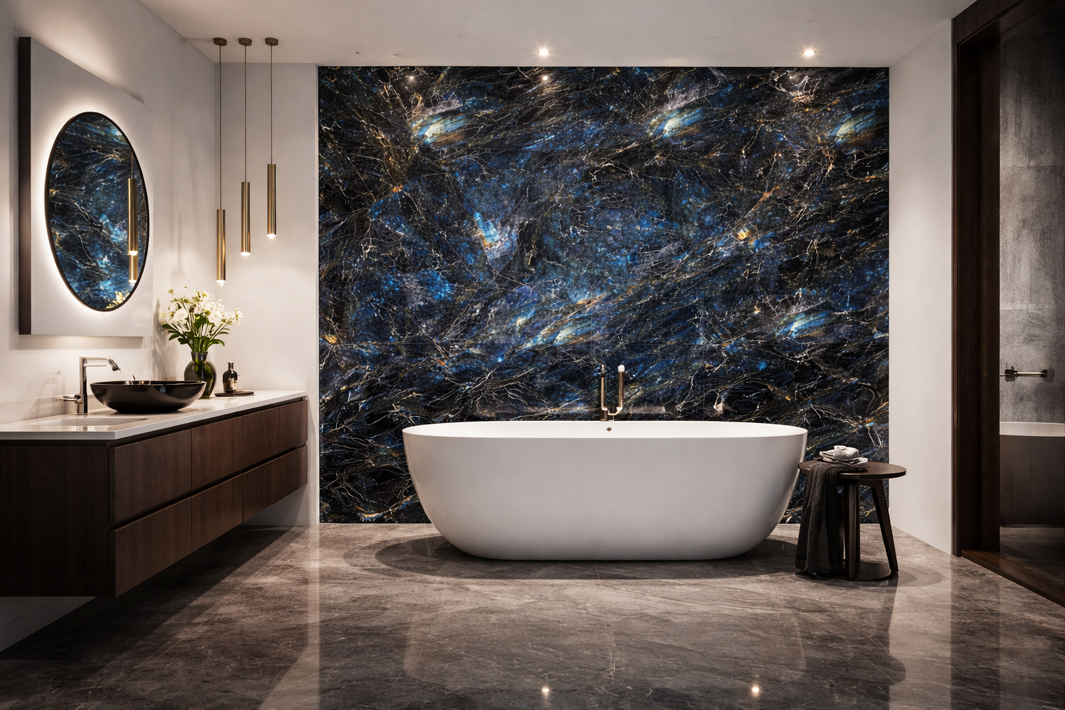 Azurea performs beautifully as a full-height feature wall in bathrooms, paired with brushed brass or matt black fittings to create striking contrast. The polished surface reflects light, making it particularly effective in well-lit spaces.