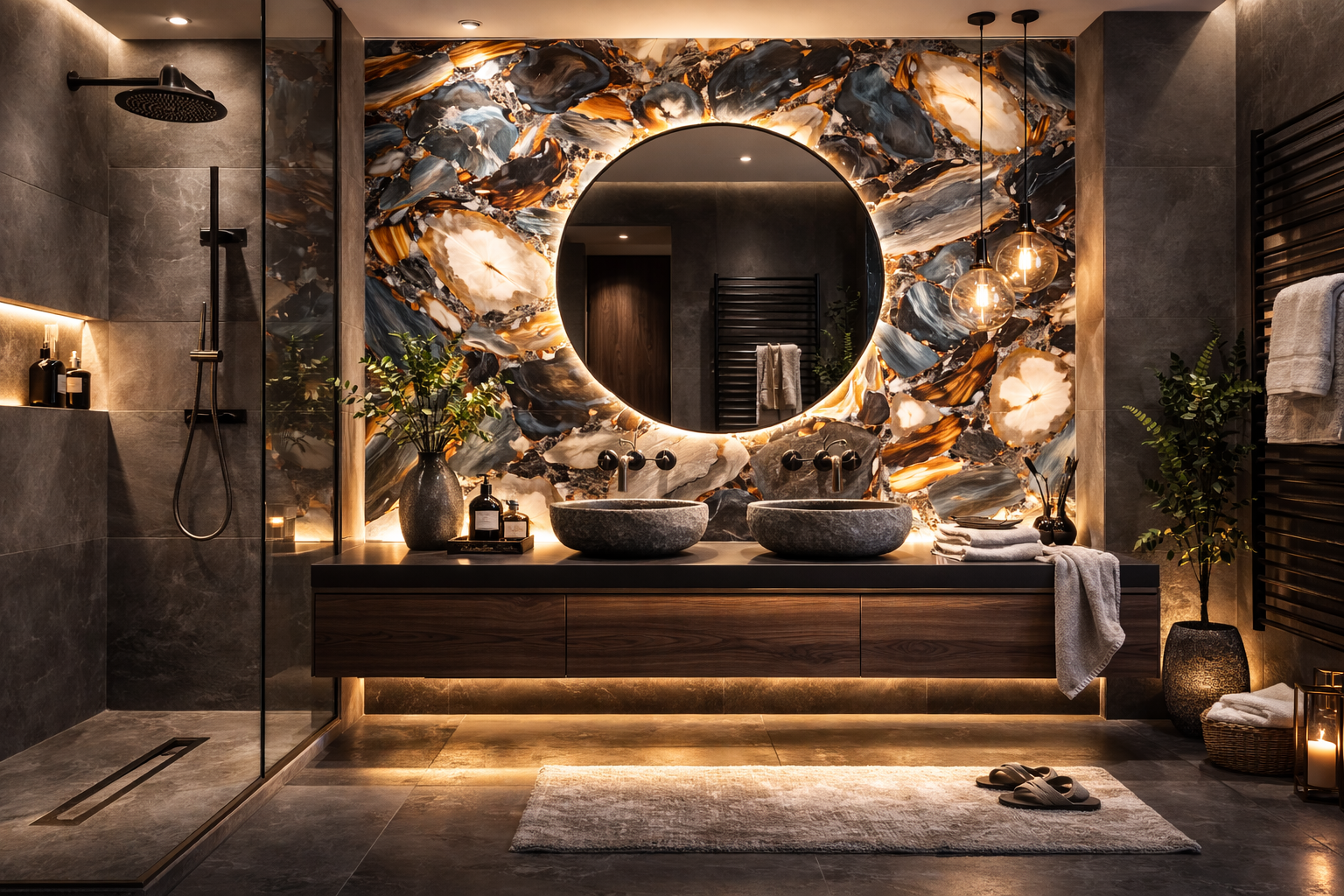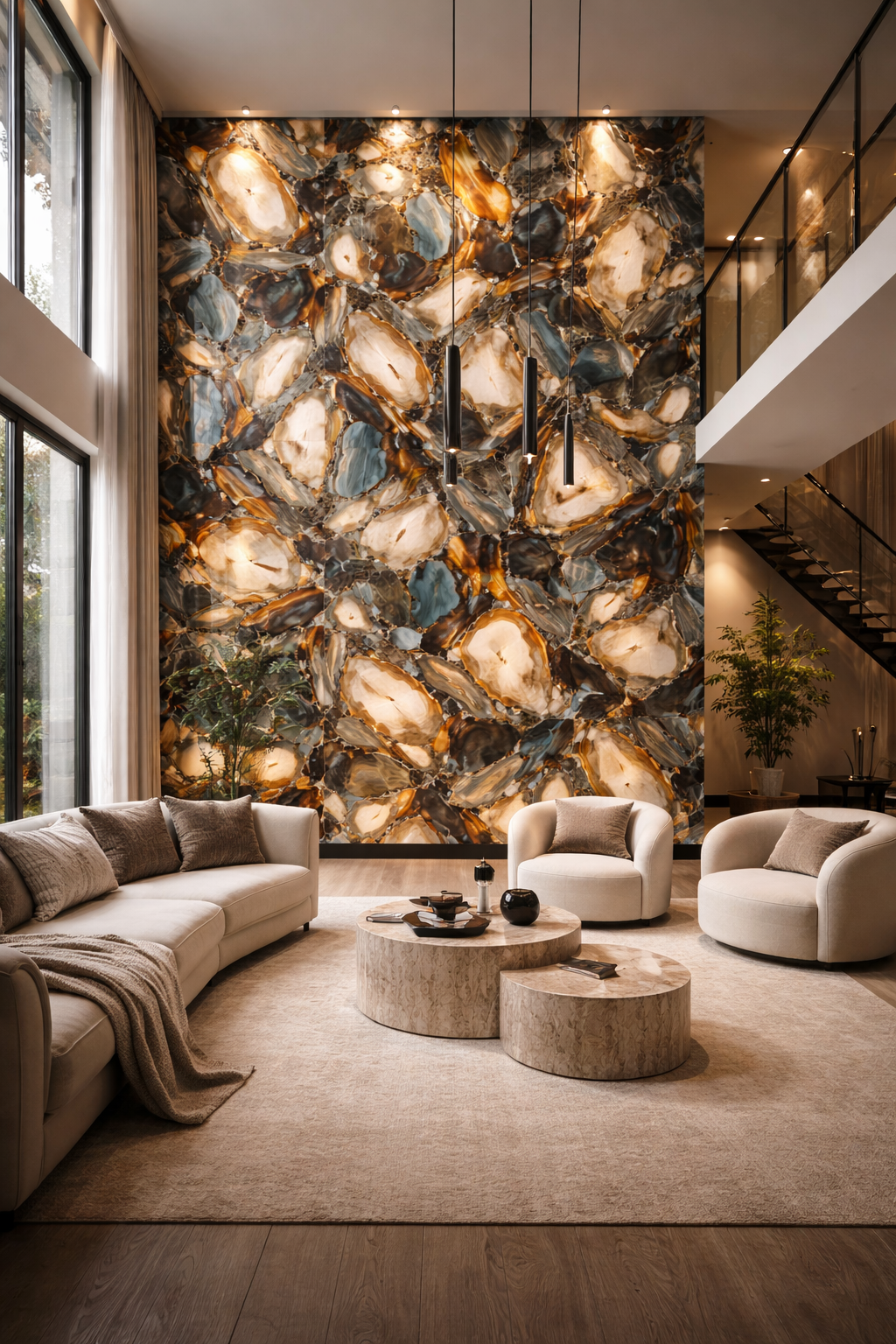 For maximum impact, use subtle uplighting or concealed LED strips to enhance the layered stone effect and create dynamic shadow play.