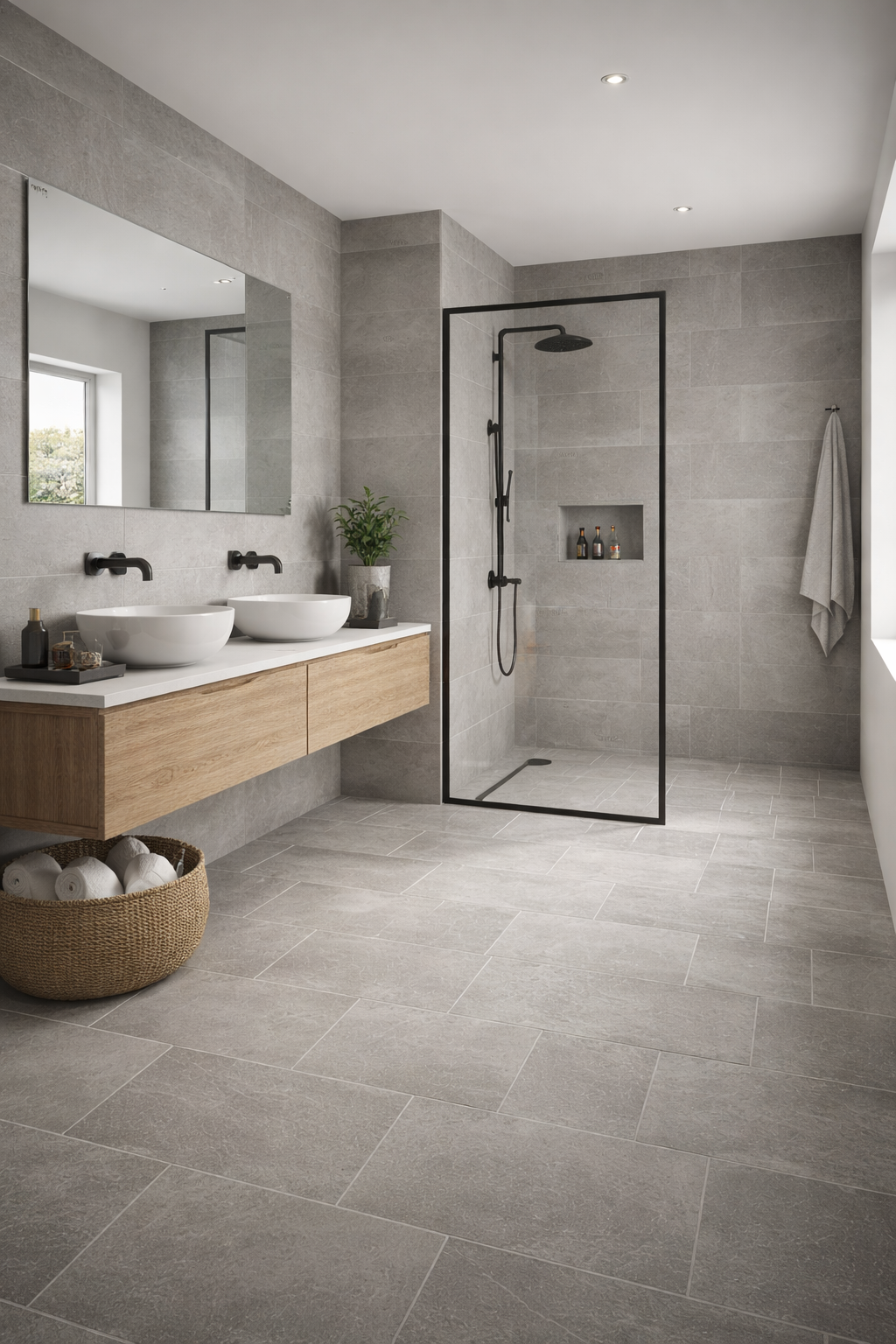 Graphe works beautifully as a full-floor solution in open-plan spaces, especially when paired with warm oak cabinetry and black metal detailing. In bathrooms, use it floor-to-wall for a seamless spa-like effect.
