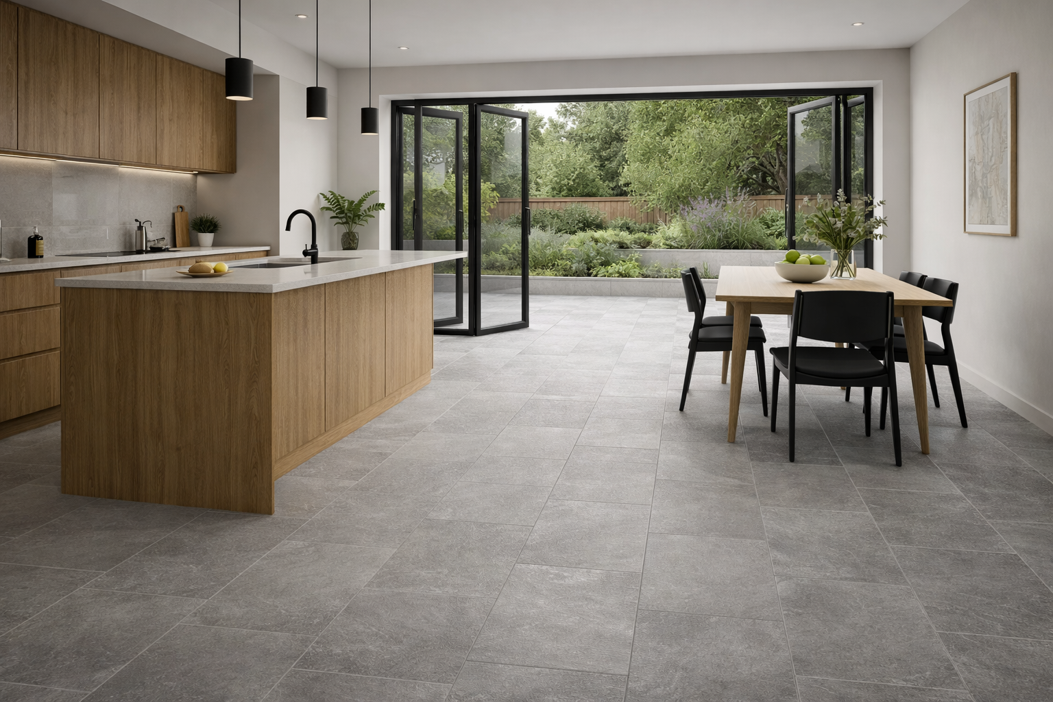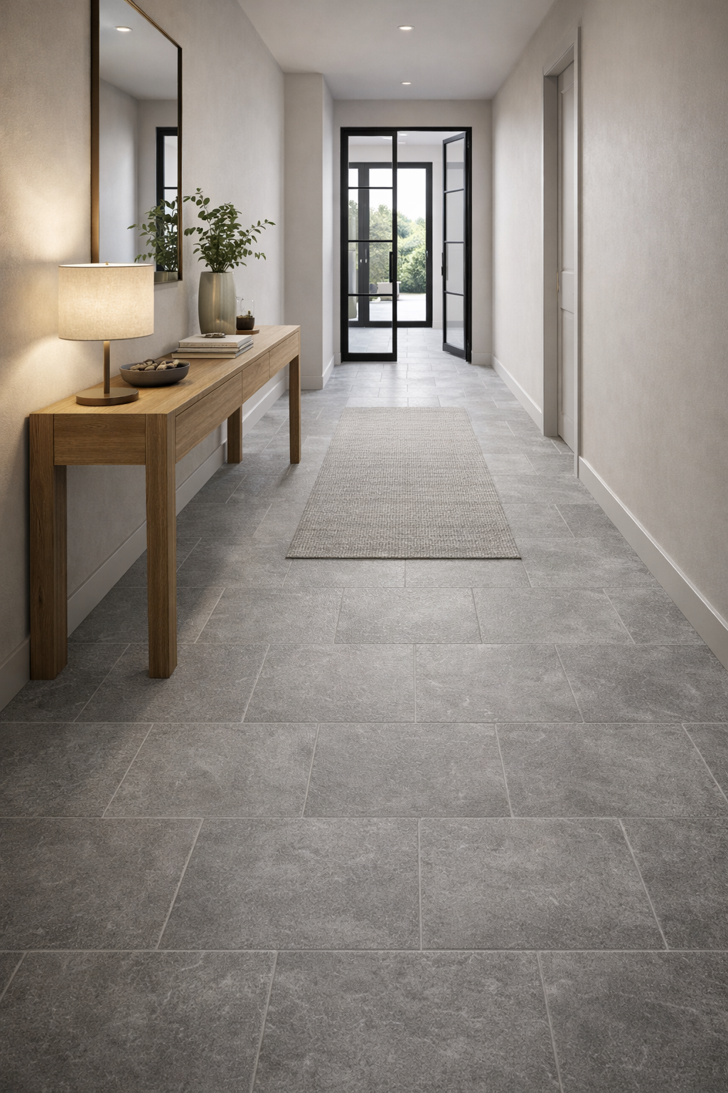 Its soft mid-grey base features subtle mineral movement and gentle tonal variation, delivering the character of real stone without heavy patterning. The matt surface reduces glare and enhances the natural aesthetic, creating a composed and grounded atmosphere that works beautifully in both residential and light commercial interiors throughout the UK.