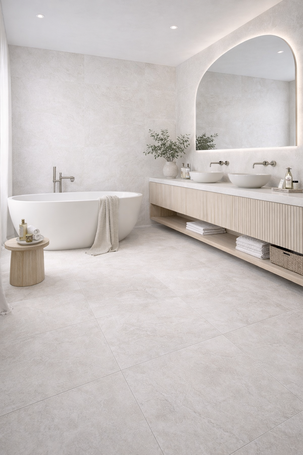 Brook Ivorel performs beautifully in open-plan kitchen-living spaces where continuity between floor and wall creates a calm architectural feel. Use the 100×100cm format for dramatic scale in contemporary settings, or opt for 60×120cm to elongate the visual flow of a room.