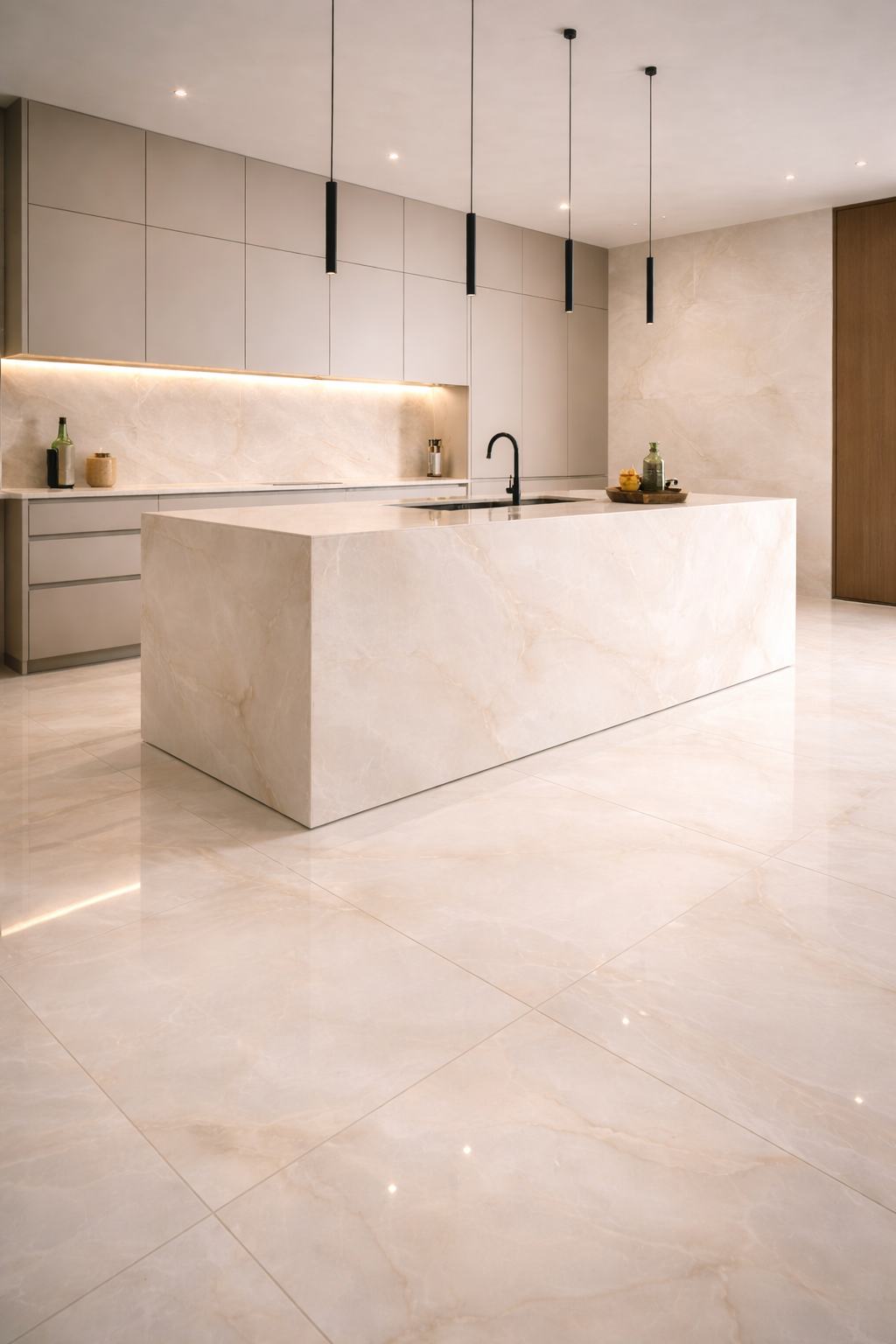 Use a closely matched warm ivory grout to maintain visual continuity and emphasise the expansive, monolithic effect.