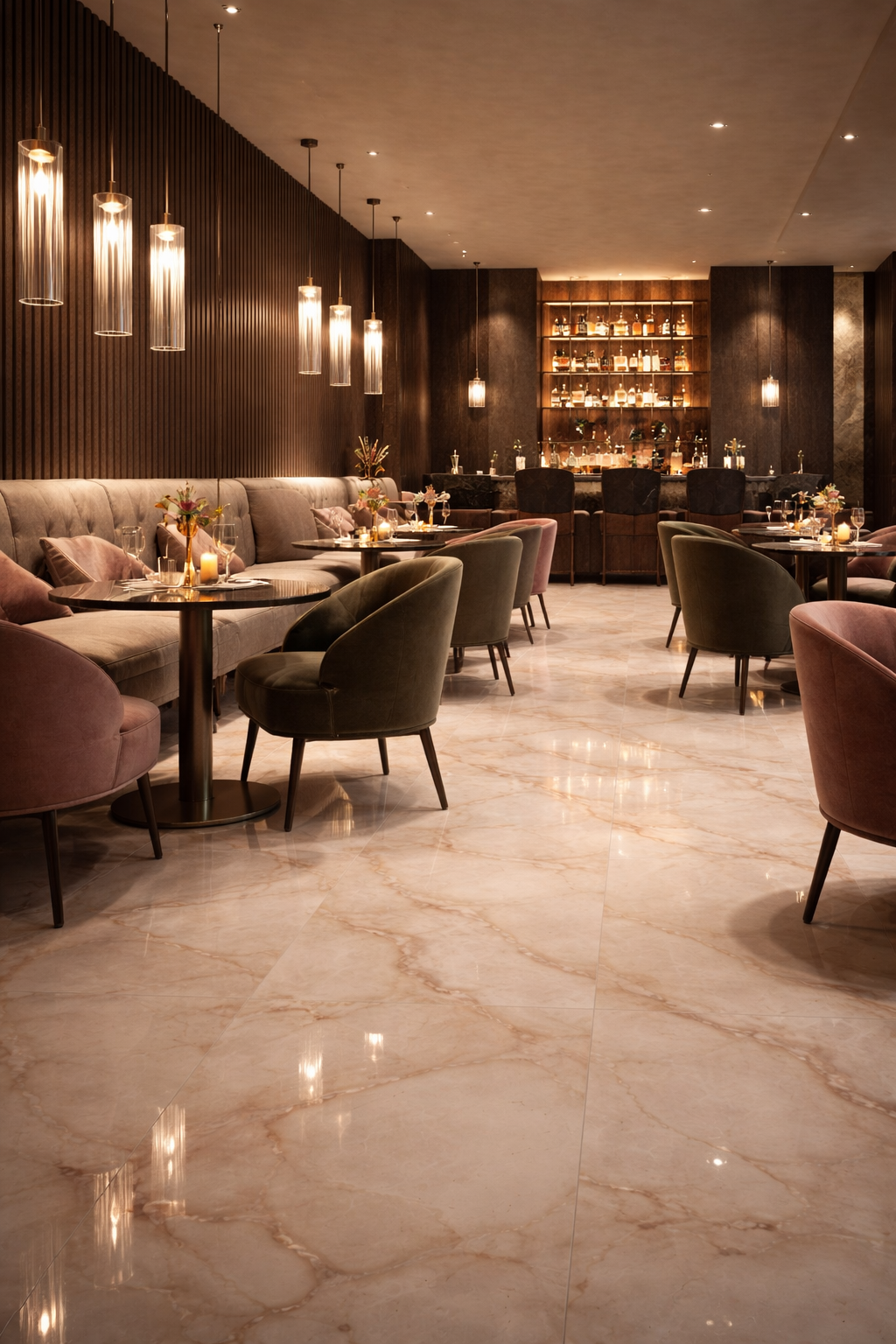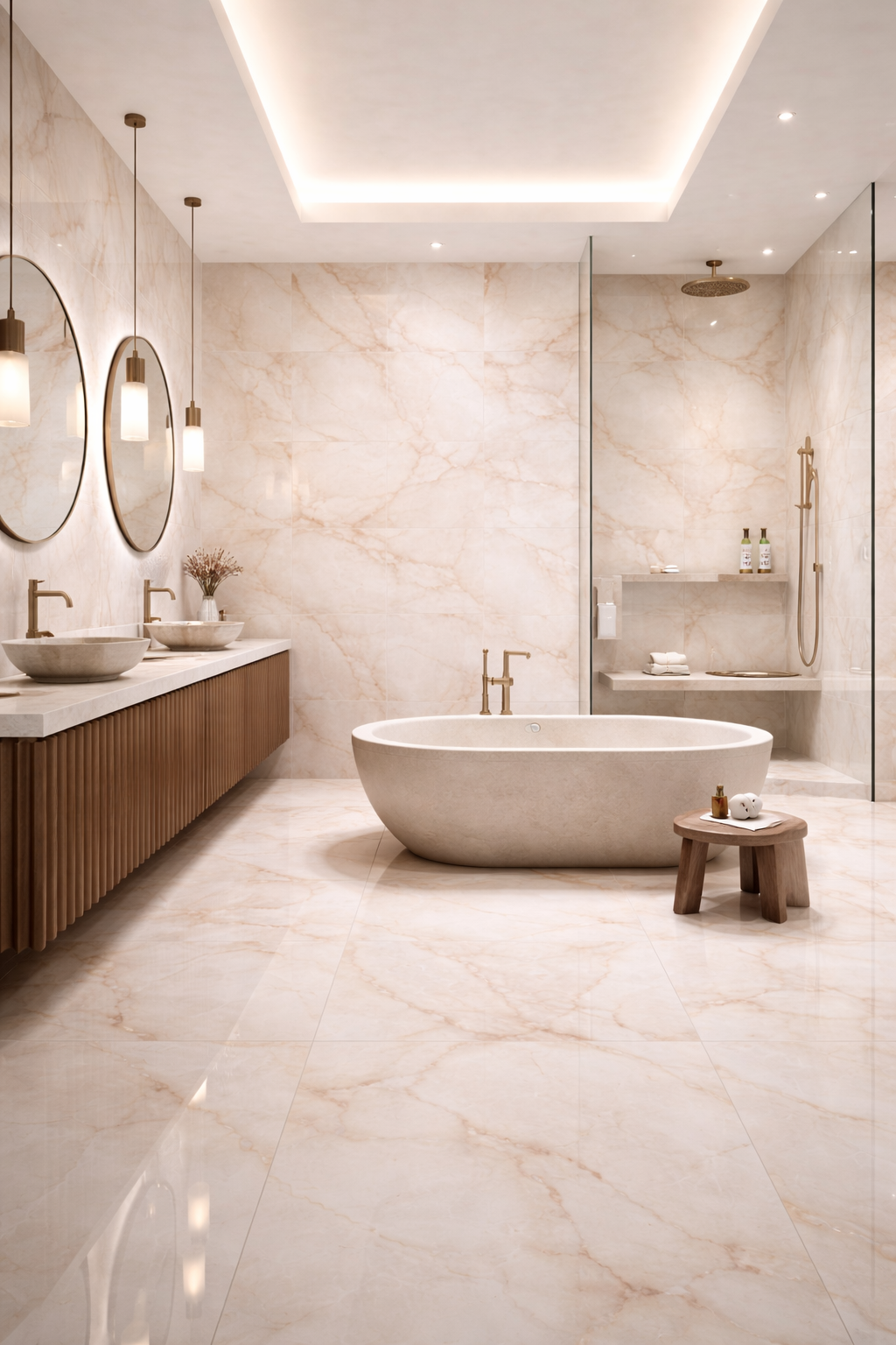 For a statement aesthetic, specify the polished finish and allow light to amplify the mineral veining. For a calmer, more architectural result, use the matt finish across walls and floors for a cohesive spa-inspired atmosphere.