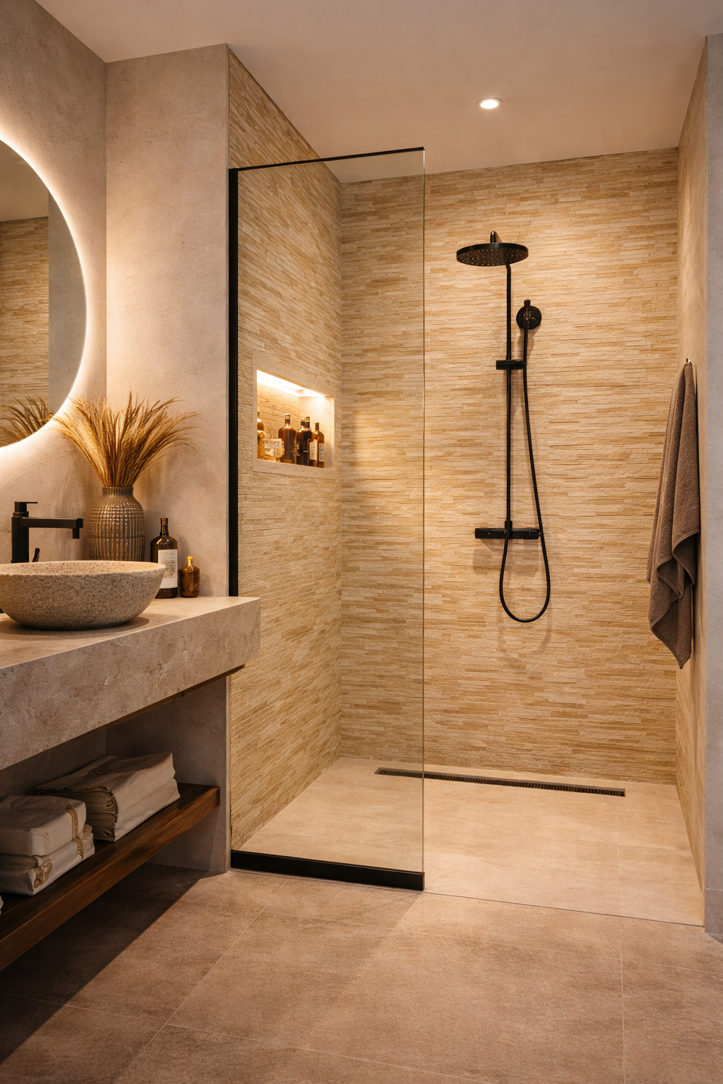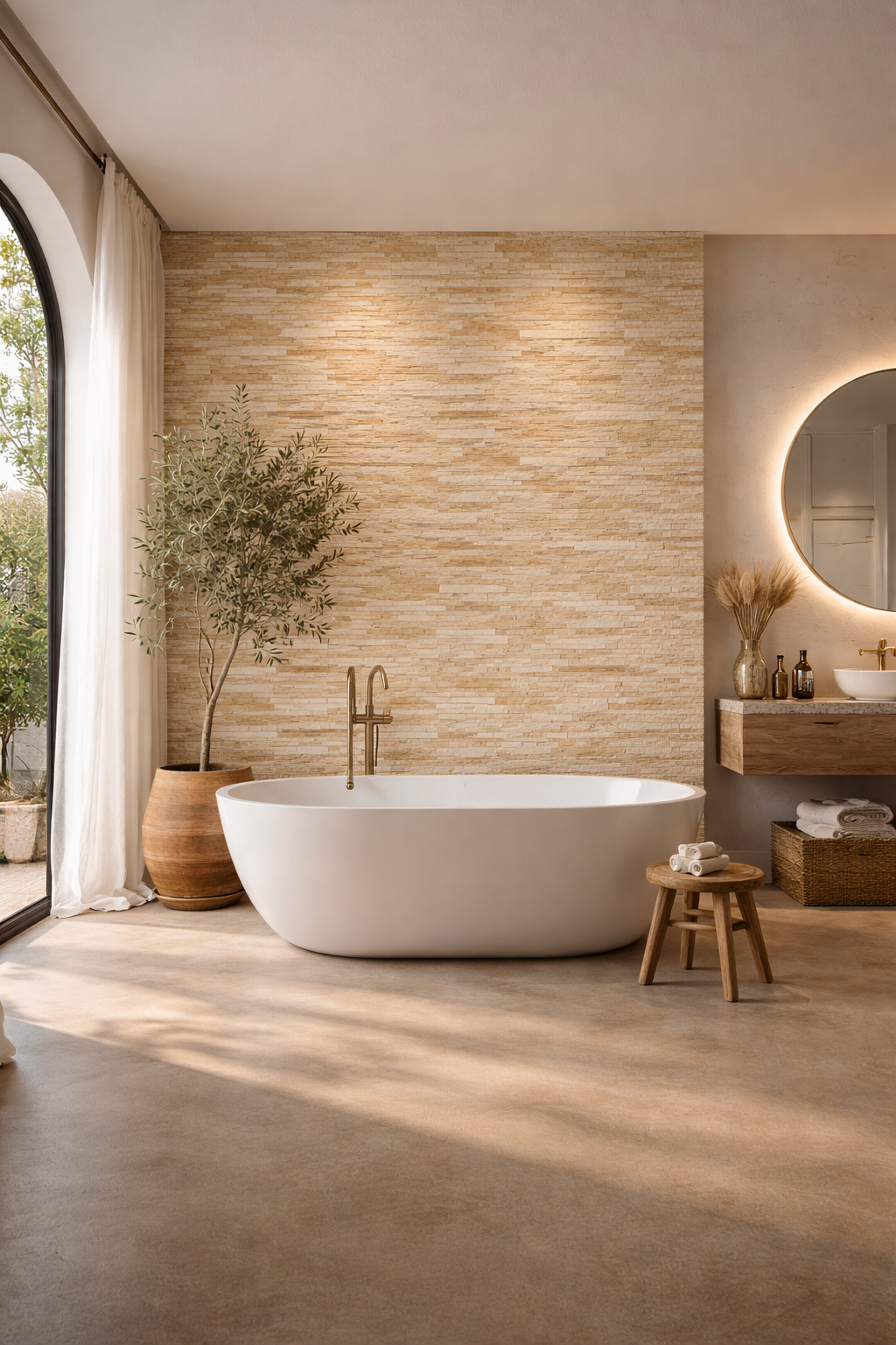 • Travertine or warm concrete flooring