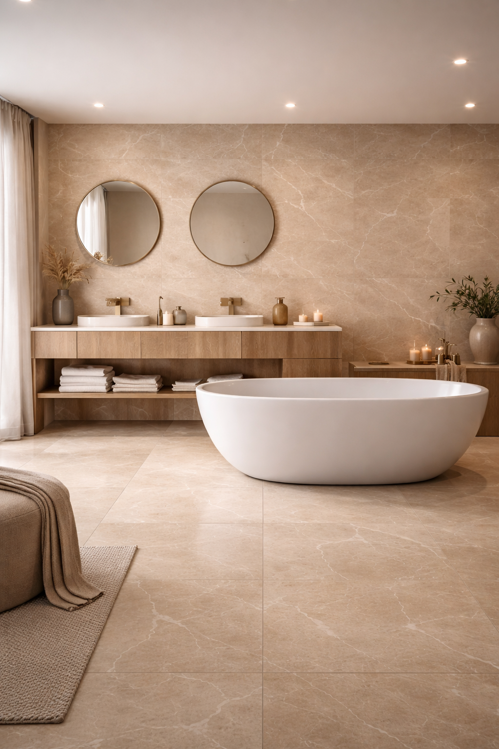 For a contemporary luxury scheme, contrast Spectra Brunello with lighter neutral tiles on adjacent surfaces to allow the brown marble movement to become the focal point.