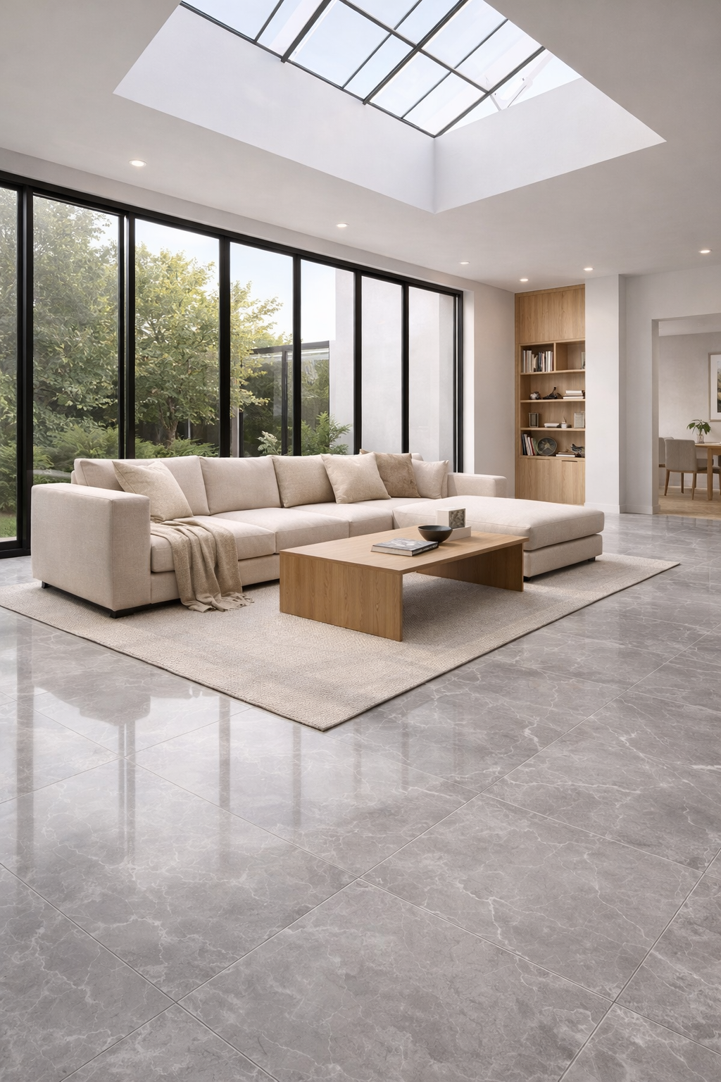 For a more dramatic effect, contrast with dark feature walls and layered lighting to enhance the polished surface reflection.