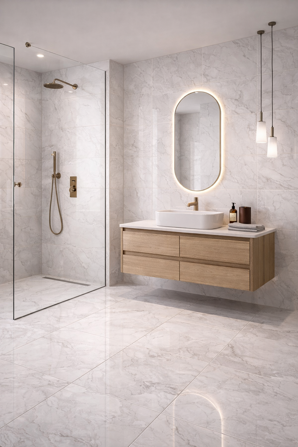 Spectra Lustro is a polished marble-effect porcelain tile available in 30×60cm and 60×60cm formats, inspired by classic white Italian marble. Its crisp white base is layered with soft grey veining and subtle mineral detailing, creating movement while maintaining a clean, architectural aesthetic.